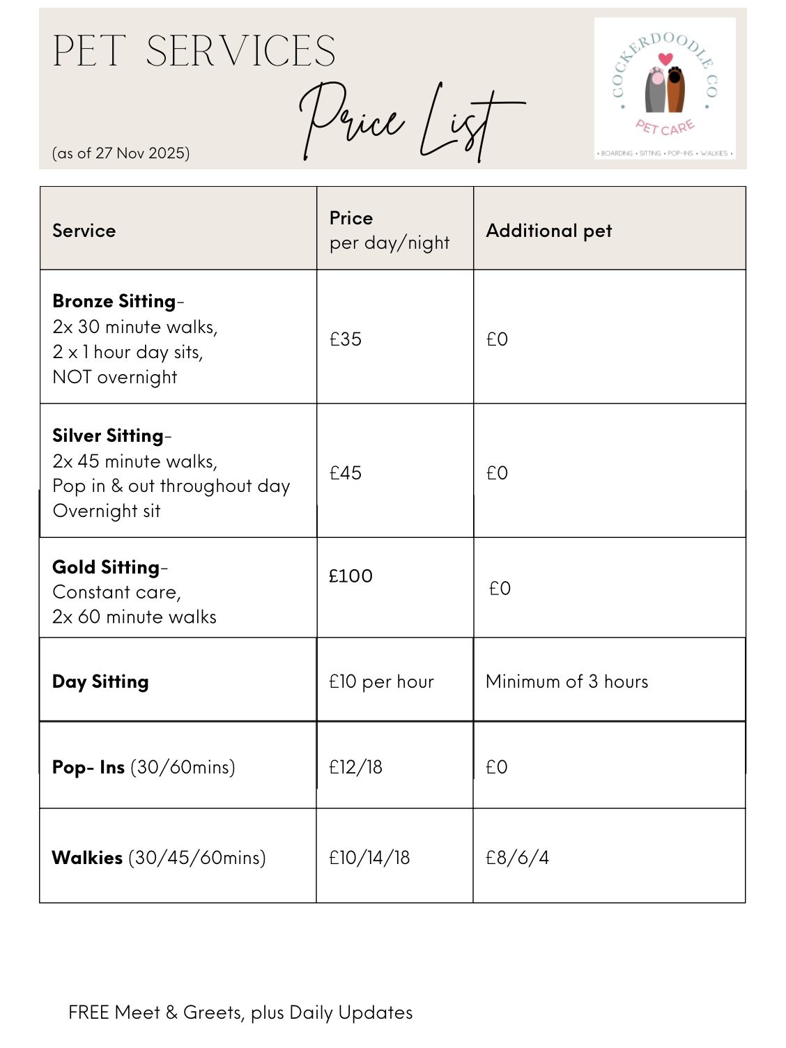 We do however charge slightly more for walks of multiple dogs, unless walks are included in a Pet Sit.
